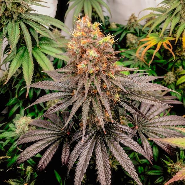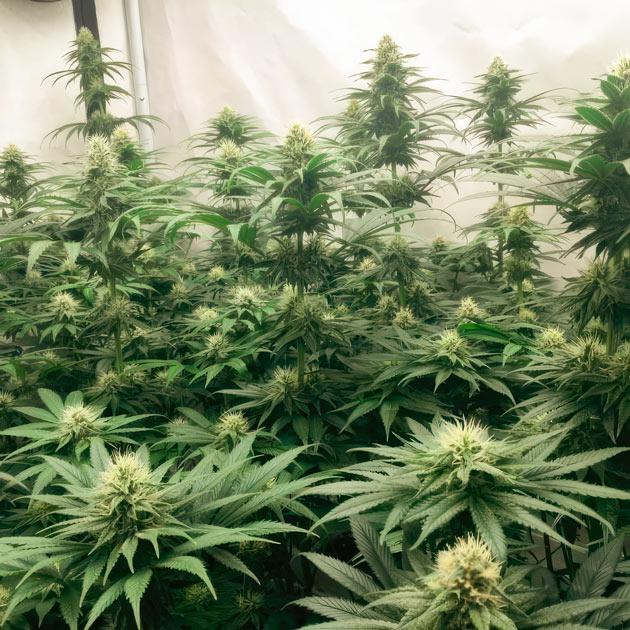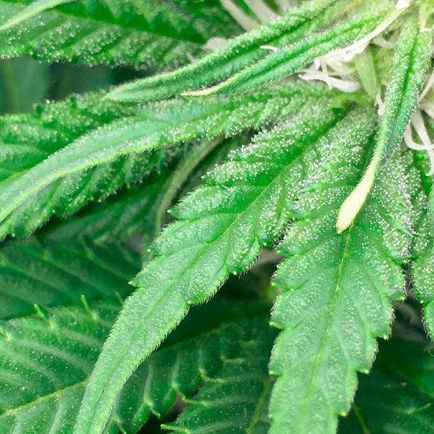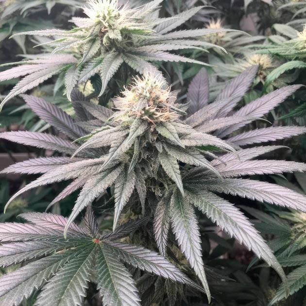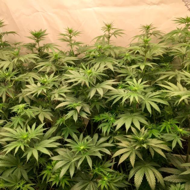 Цветение идет полным ходом. Кусты выглядят очень внушительно, крупные соцветия срастаются в одну сплошную мегашишку даже на таких ранних этапах. На листьях много «сахара», а запах становится все сильнее с каждым днем. Некоторые растения действительно имеют фиолетовый фенотип. Находясь в равных условиях, они уже ушли в сине-зеленый оттенок, пока другие остаются изумрудными.