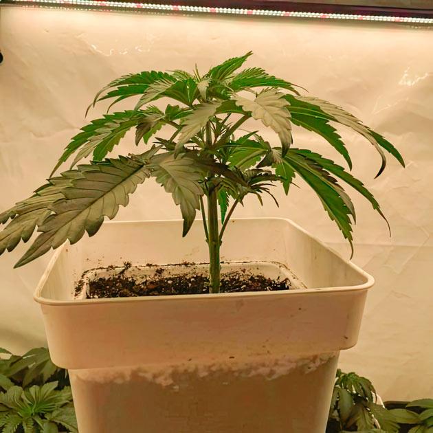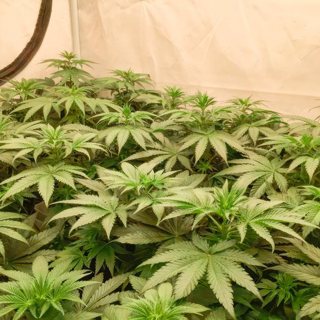В качестве субстрата для посадки давно уже использую BioBizz All Mix. Классная легкая органическая почвенная смесь, которая в комплексе с удобрениями этой же фирмы делает чудеса с каннабисом. Мне даже не нужно делать замеры pH и ЕС дренажа, так как почвенные бактерии там сами балансируют среду. А вот подкармливать растения из-за маленького объема горшков нужно обязательно, особенно на этапе цветения посадки. Ну а первую неделю нужен только легкий полив водой, и 24 прелестных подрастающих красотки уже сияют под софитами своими зелеными листочками.
